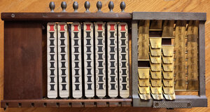 Beschreibung......: Multipliziergrät zum Multiplizieren zweier mehrstelliger Zahlen in einem Durchgang. Der erste Faktor wird durch Drehen an Knöpfen als Vielfachentabelle für eine Zahl mit bis zu sieben Stellen dargestellt. Den zweiten Faktor mit max. fünf Stellen stellt man durch Hochklappen von kleinen Abdeckungen im Schlitten darüber ein. Danach wird der Schlitten quer bewegt und in jeder Stellung werden die erscheinenden Zahlen addiert. Sie ergeben jeweils eine Ziffer des Produkts.Besonderheiten....: